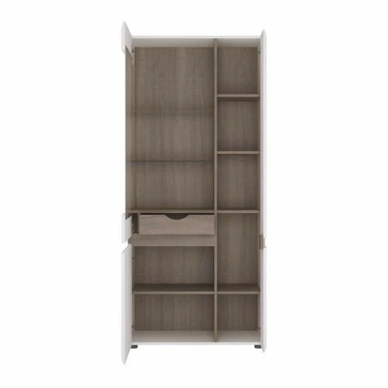 The tall unit features a modern handle-free solution with soft close mechanism for everyday convenience. The doors conceal multiple useful shelving to organise your belonging, as well as a handy hidden drawer.