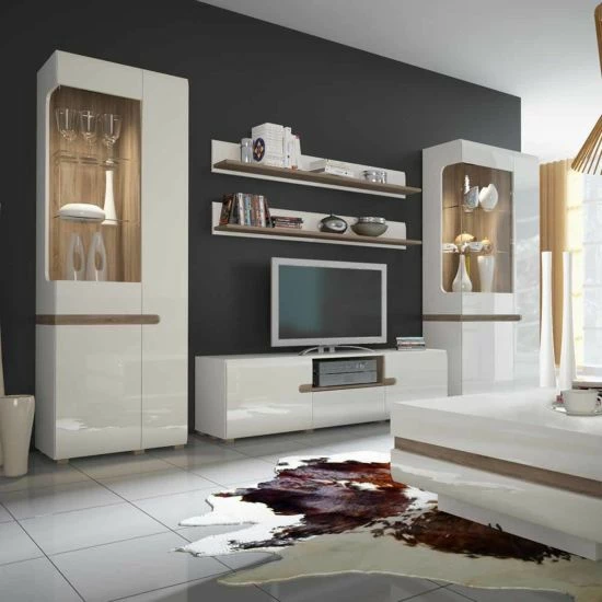 Made from laminated board which is resistant to damage, scratches, moisture and high temperature, this display unit features white melamine fronts with a high gloss finish and contrasting oak melamine trim.