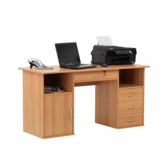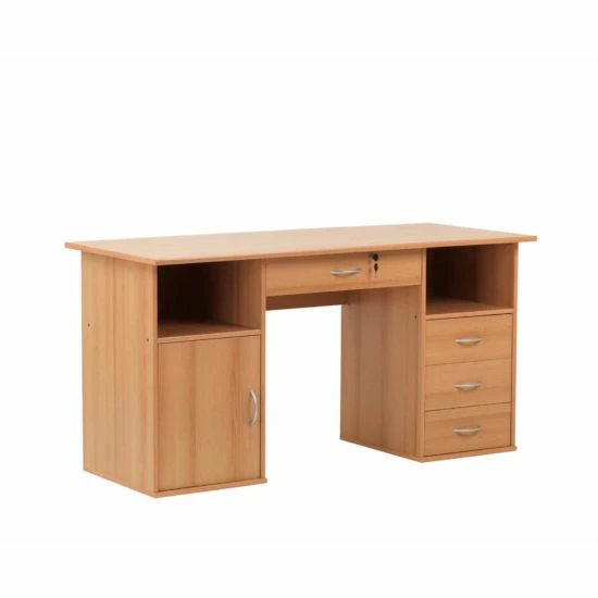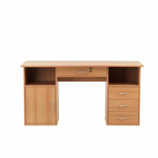 The desk is finished in a hard-wearing, durable beech veneer effect with complementary silver cupboard and drawer handles.