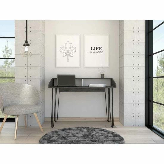 Finished in a carbon grey oak effect melamine, this desk is durable against everyday use and easy to clean. It features stylish and contrasting metal hairpin legs for a mid-century modern style and provides a generous work surface for laptop work or studying.