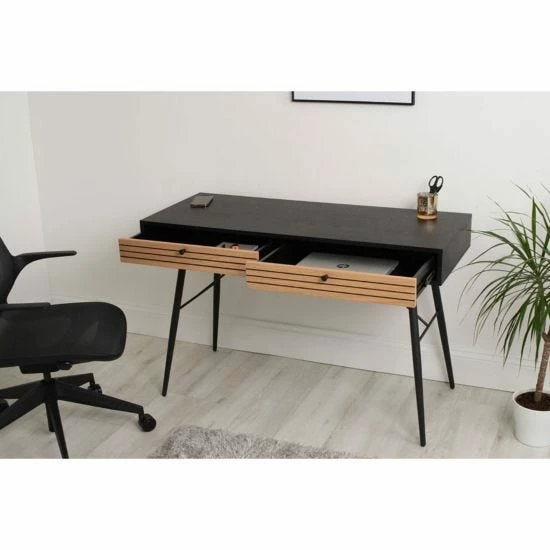 Keep your work essentials organised in the distinctively grooved, oak effect drawers which stylishly contrast with the black wood effect finish and tapered black metal legs.