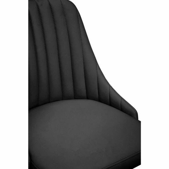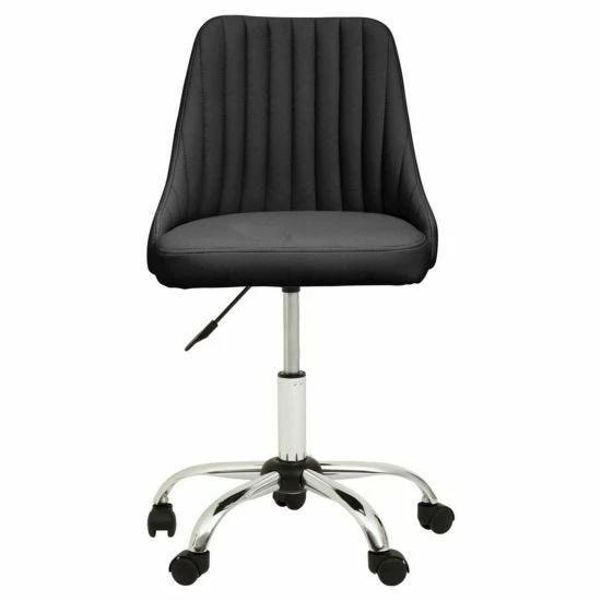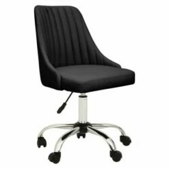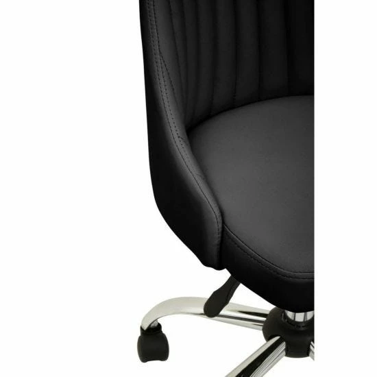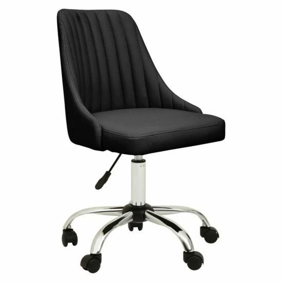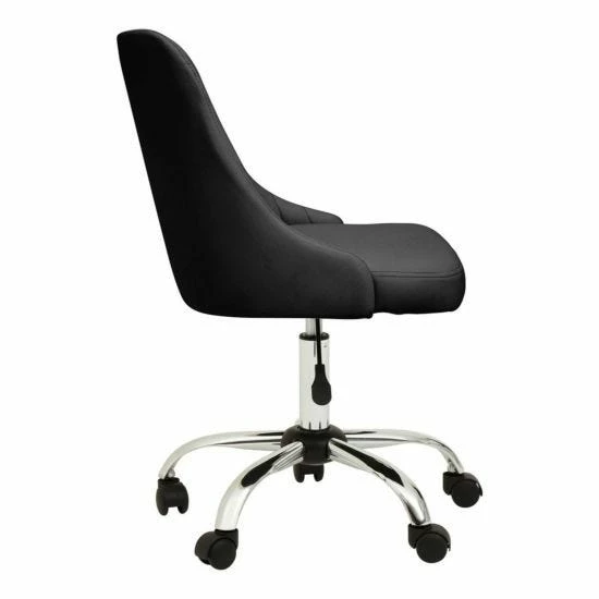 This chair offers extra plush seating along with a stylish linear tufted seat upholstered in black fabric. With an armless wide seat, its three-sixty degree swivel, adjustable seat and casters are based on a sturdy chrome base.