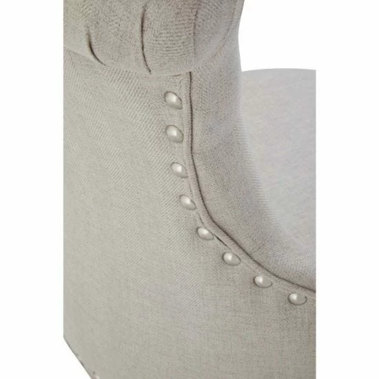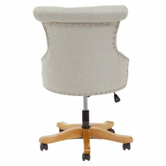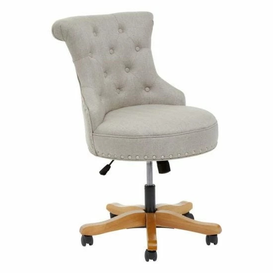 This chair features a round padded seat upholstered in fabric with a stud detail trim at the front and a button tufted winged back. Height adjustable with swivel action, the wooden base of this chair ensures swift mobility with five hooded castors.
