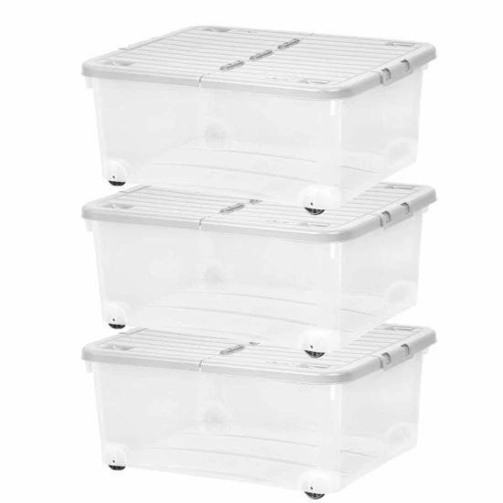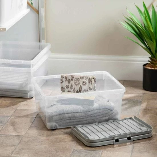 The double wheels make this box easy to transport and the reinforced corners offer it extra durability. The split lid allows easier access to the boxes contents. Nesting inside one another when not in use and stackable when they are, opening up plenty of space in the room